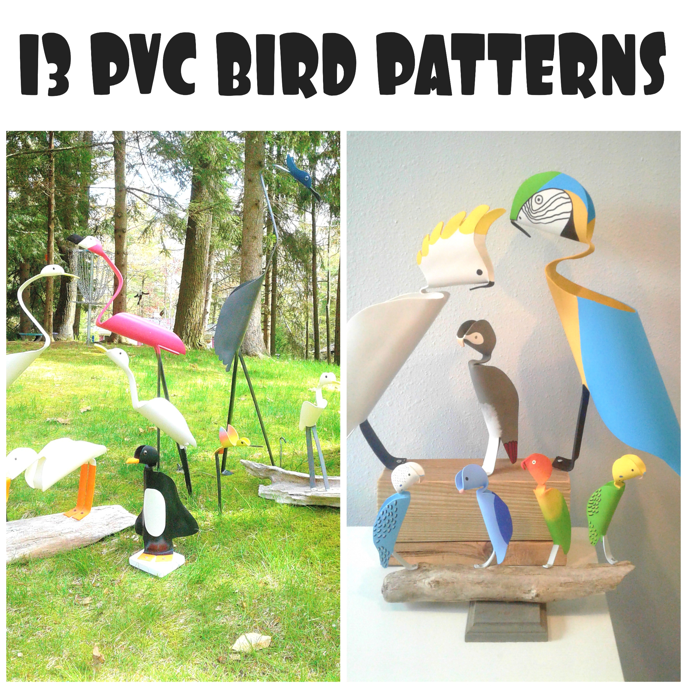 13 PVC Bird patterns and tutorial (PDF) You are not buying an actual pvc bird. You are buying the patterns to make the birds yourself. YOU WILL NOT RECEIVE ANYTHING IN THE MAIL. THIS IS A PDF DIGITAL DOWNLOAD FILE. Ok, now that everyone understands this is a digital download....let's get to the fun stuff. Your PDF download will include: * Printable patterns to make the all 13 of the following birds: Blue Heron, Large Egret, Penguin, Woodpecker, Hummingbird, Flamingo, a basic bird on a stake, Pelican/duck, small Egret, Macaw, Cockatoo, small parrot and a parakeet/lovebird. * 30+ pages of pictures, patterns and detailed instructions * How to prepare your patterns * Tracing your patterns * Cutting out your birds * How to heat and cooling your birds * Shaping your birds * Painting your birds * How to prepare and display your birds * A complete list of all the materials needed to make and paint your birds You will need a printer to print off your patterns. All patterns will print on a traditional 8.5" X 11" size piece of paper. My bird patterns will make birds of the following sizes. Sizes will slightly vary depending on how you mold and shape your birds. The following sizes are approximate based on how I have them molded in the picture above: Blue Heron = 37" tall Flamingo = 35" tall Large Egret = 30" tall Woodpecker = 14" long Small Egret = 14" tall Hummingbird = 10" tall Penguin = 12" tall Basic bird on a stake = 21" tall Pelican/duck = 12" tall Macaw = 23" Cockatoo = 15" Small parrot = 9" Parakeet / lovebird = 5.5" You will instantly receive the PDF download after your purchase. The link to the download will come from SendOwl - the company who processes your order. Make sure to download and save it to your computer. You may print off the patterns and sell the birds you make with them as your own. You may not resell my patterns or the PDF. $60 USD* * We do not offer any business support by purchasing these patterns. No sales goals are typical. No prices are typical. How you sell these PVC art pieces and what you sell them for is entirely up to you. These are only my results and my opinions. We will not be held reliable on the success or failure of your pvc art. We are offering this large selection of our pvc patterns to you as a way for you to obtain the majority of our patterns at a special prices. Disclaimer |